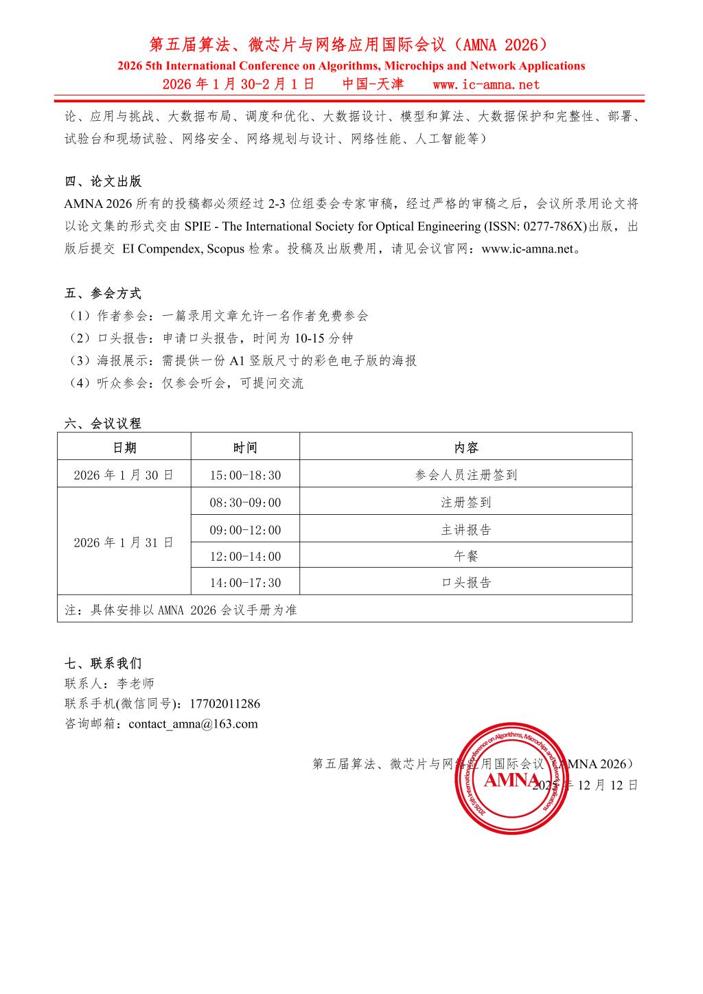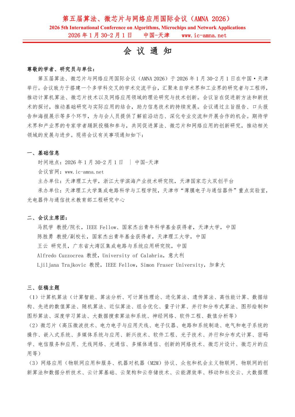 第五届算法、微芯片与网络应用国际会议(AMNA 2026)通知