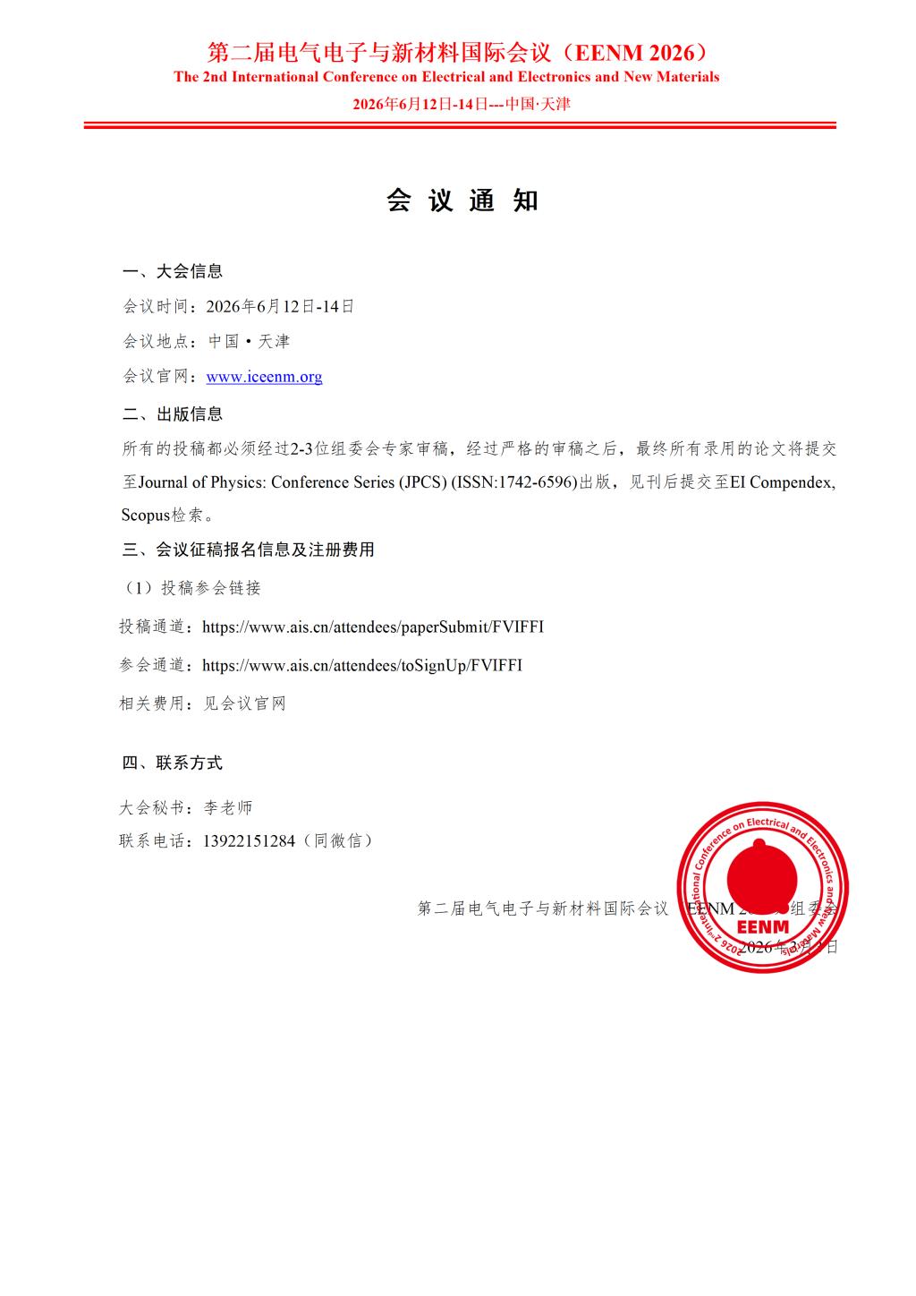 第二届电气电子与新材料国际会议(EENM 2026)通知